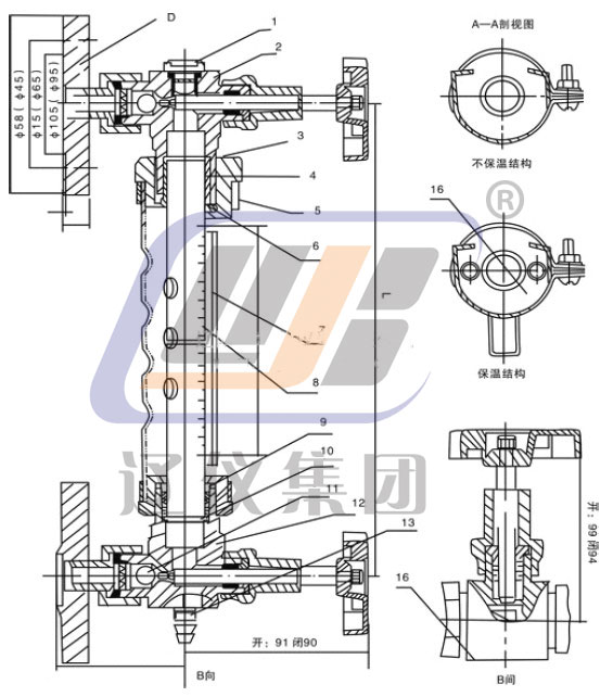 9.壓蓋螺母 10.底環(huán)‖  11.鋼球 12.下閥 13.排污接頭 14.保溫管 15.平焊法蘭 16.標(biāo)牌
